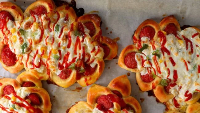 - Wrap the dough around the dried hotdogs covering all parts and stitch the seam together